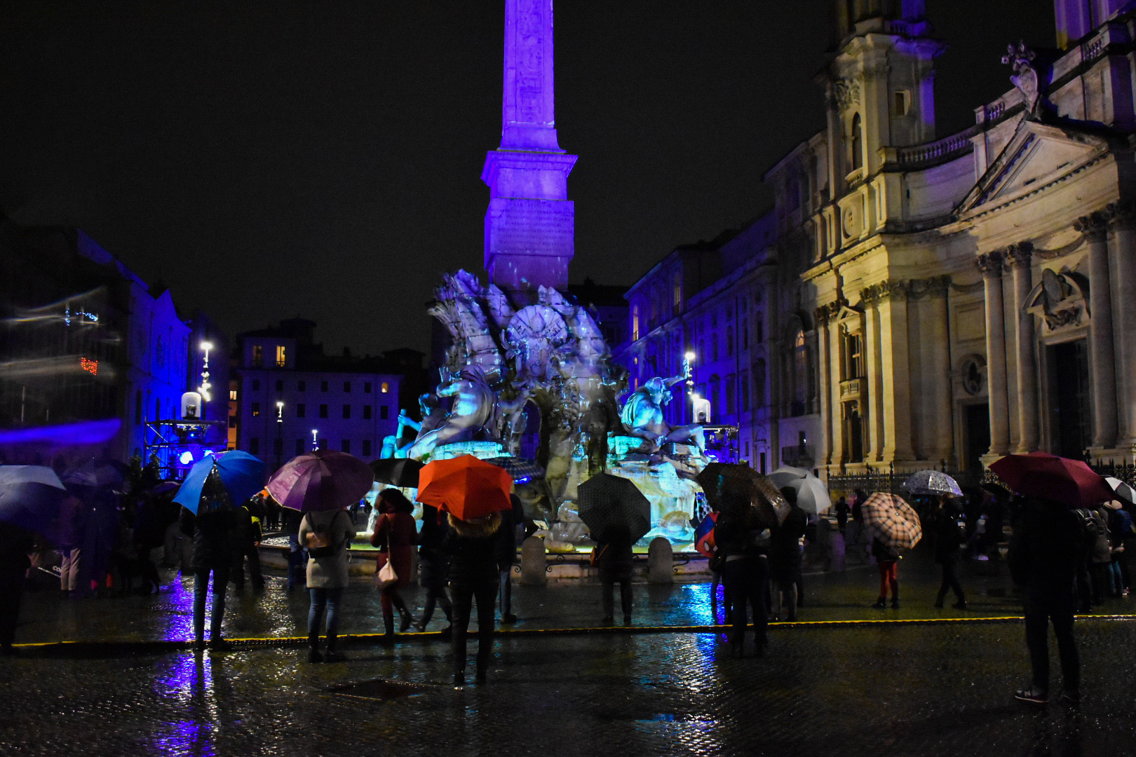 La Fontana dei Quattro Fiumi (The Fountain of the Four Rivers) beamed a most vivid azure with a violent purple obelisk. So, it was a blue and purple, lit-up fountain. Not exactly riveting stuff. All of a sudden, I noticed dozens of people with umbrellas gathering. Sound effects bellowed from four speakers that surrounded the four rivers and then the light display began. My instinct was to frantically Google the symbolic meaning of the display or record every second of it. Something told me that it was better to take it in and allow the sounds to melt into my mood. It felt like an interpretation of the seasons or the passing of time as the fountain was adorned with different projections of earthy golds and flaming reds. I somehow, being a sentimental type, connected it in my head to the way 2020 has transpired with moments of unity, joy and sorrow. I felt like I was watching a phoenix, us as a global community, rising from the ashes of COVID. My fanciful sentiments aside, I stayed to watch the display again and took photos for your pleasure.