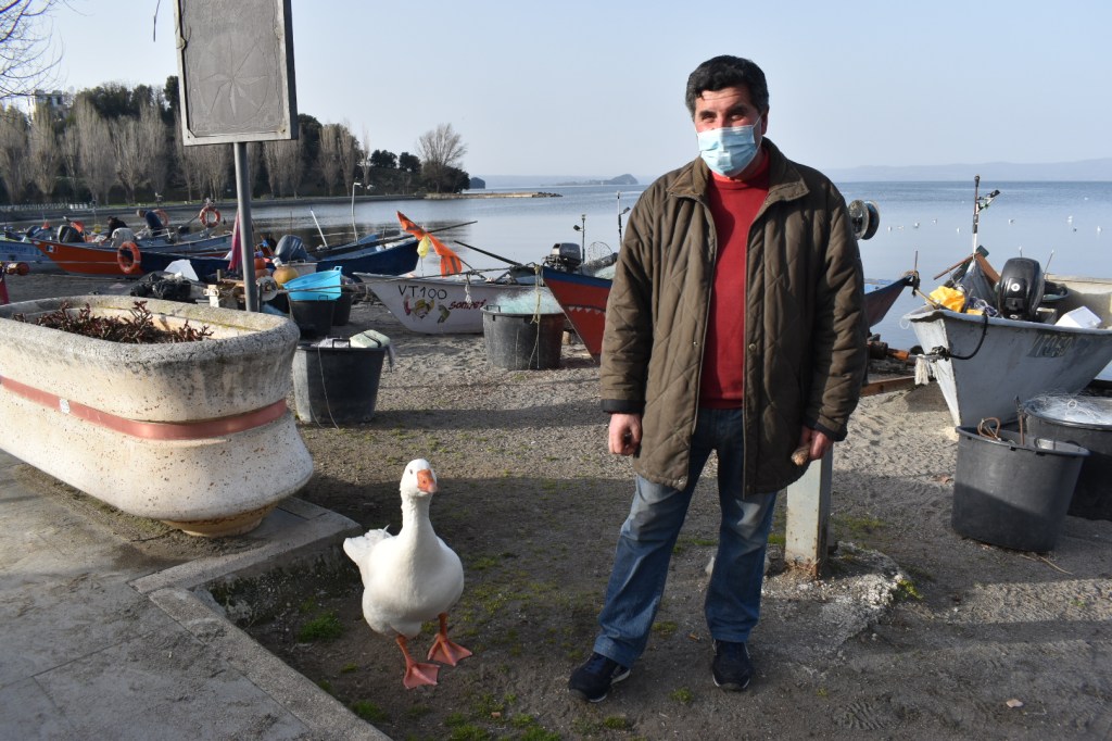 This local afternoon at Marta was really about a goose, fisherman and two spectular views. After letting my GPS wear the pants for the drive there, I used the distant Medieval tower as my beacon and wound through the streets of the modern part of the town to reach it by car. Intially, I had expected a castle here. It did, after all, sit atop a small rise and had a tower. Instead, the castle has long been destroyed and all that stands there is a clock tower with the crest of the Farnese family. The view, however, was indelible. Marta, the lesser-known village that is perched near the Bolsena lake, has a sweeping prospective of the largest vulcanic lake in Europe. Montefiascione is the other village that has a wonderful report card for the views, but Marta seemed authentic. The castle’s former sight was self-indulgently mine for a good half-hour.