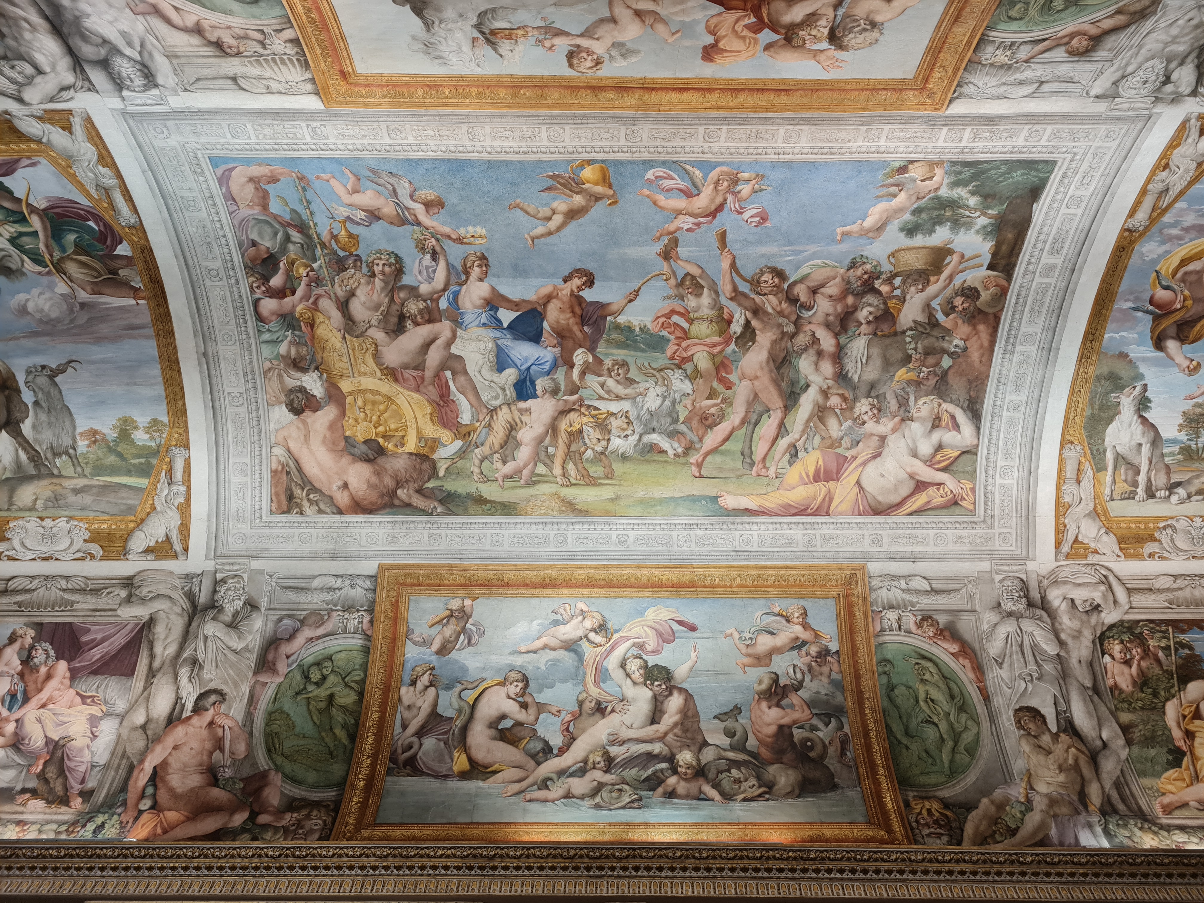 What will you see? Only some of the most seductive frescoes you will see in your life called “The Loves of the Gods” (1597-1608) by Annibale Carracci. Living in Rome, you see a lot of, put rather simply, painted walls and ceilings – I’m sure most of you instantly think of the “Sistine Chapel” famously frescoed by Michelangelo. I’ll be honest, religous art does not allure me into deprave fantasy. It can be by a master, but it takes a lot for it to stand out in a sea of Last Suppers and Sacra Famiglia competitors. Carracci’s masterpiece, however, somehow plunges me into an erotic world of fancy in the vein of Shakespeare’s A Midsummer Night’s Dream: imagine (or view the photo above) sumptuous scenes of Gods and Godesses. The centrepiece on the ceiling is the “Triumph of Bacchus and Ariadne” a myth in which the God of Wine, Bacchus, allures a damsel-in-distress princess Ariadne.